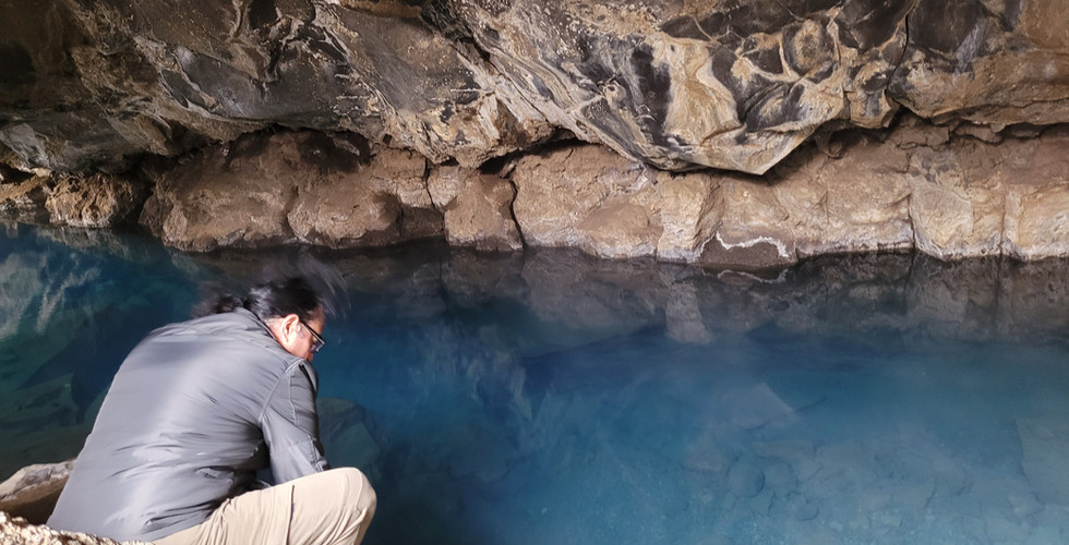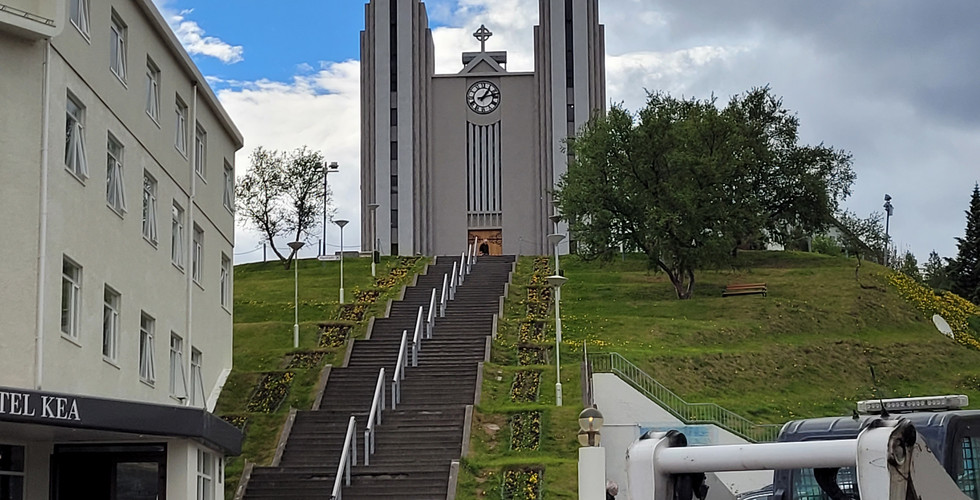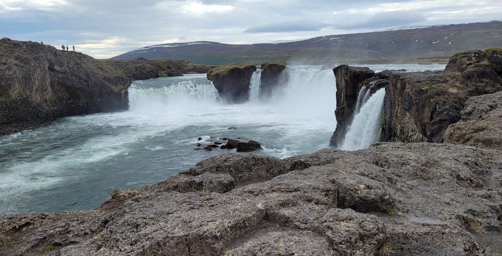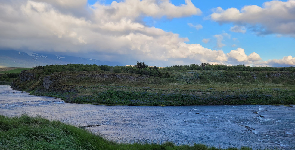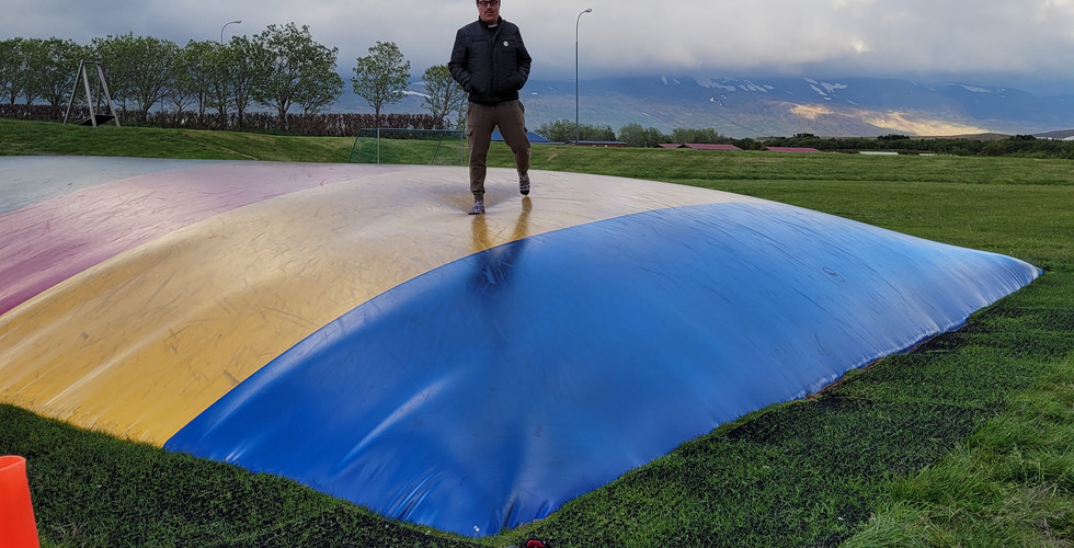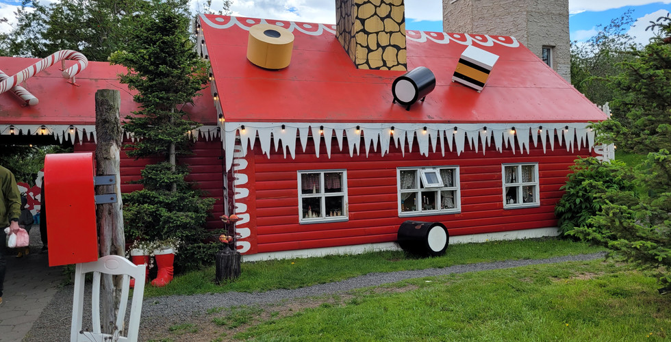 Well, after all this adventure I guess we were ready for a slow, and somewhat bad, day! We checked out of our tiny room and hit the one spot we had left in the Lake Myvatn area - a lava cave, Grjotagjia. that was used in a steamy Game Of Thrones scene. Anyway, it was very pretty. Next, we visited Godafoss - a beautiful waterfall about a half hour away. We found out a day or two ago we have to get another COVID test 3 days before our flight, and a pharmacist told us that we needed to go to a hospital. I found one in the town on our itinerary for today, Akureyri, but when we got there, they said to go to the clinic downtown. We parked downtown and we had just missed the COVID testing time by 2 hours (none of this is listed anywhere online). No worries, we'll get one in Reykjavik. So, we were heading back to the car when we saw that there was an early happy hour. The beer was well priced, but the veggie tacos were about $18 and they were TINY! At least the beer was good and cheap! But when we go back to the car, lo and behold, we had a parking ticket. Nowhere did it say anything about paying to park...although there was a sign far away from where we parked that said clock at the gas station (I guess their English translation isn't very good - who would think that would mean we have to pay to park in this small town?!?). Anyway, $25 later, the happy hour was very much over. To boost our spirits, we went to Christmas House - a Christmas themed shop which had tasty treats (and an odd boob art piece, see below) - we got a few cookies called Dreams that were some of the best shortbread cookies I've ever had. It was very windy all day - making driving a bit difficult - and when we arrived in Blondous, it was very difficult to even get into the hotel. But our hotel is big and spacious - everything is purple, my favorite color. We opted for an American/Ethiopian restaurant for dinner and everything we ordered was fantastic. Afterward, we found a park with a bouncy spot (see below) and took a look at an island on the Blonda river that is closed for two months of the year for birds to nest. Good for them! We were too lazy to actually go over - plus the wind was just unbearable (Ian said the gusts are at 140 kph!)