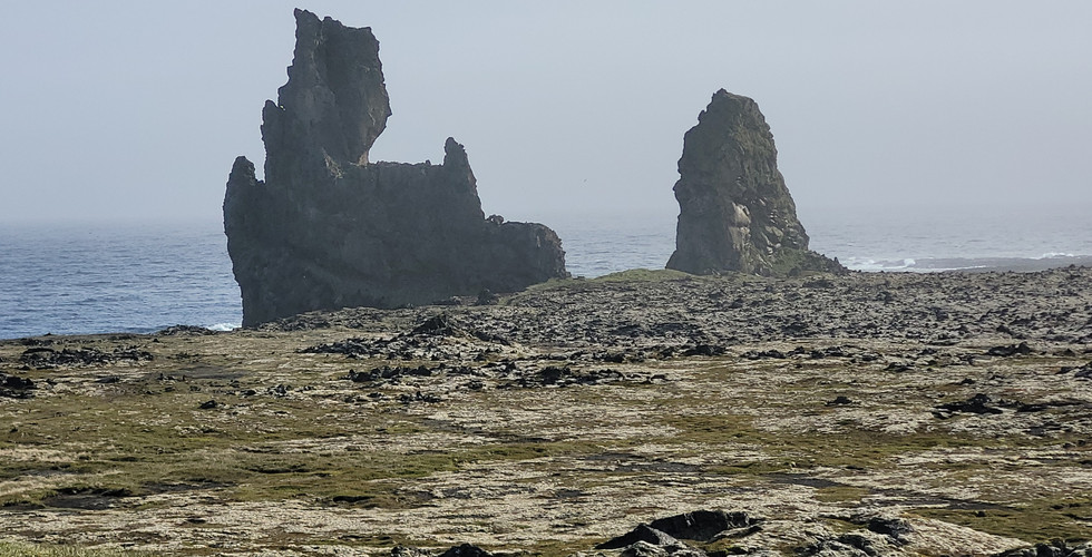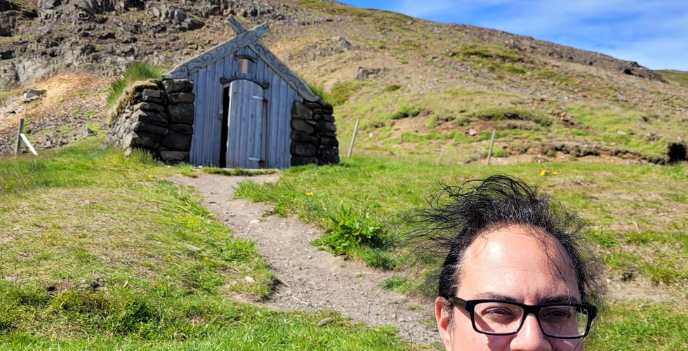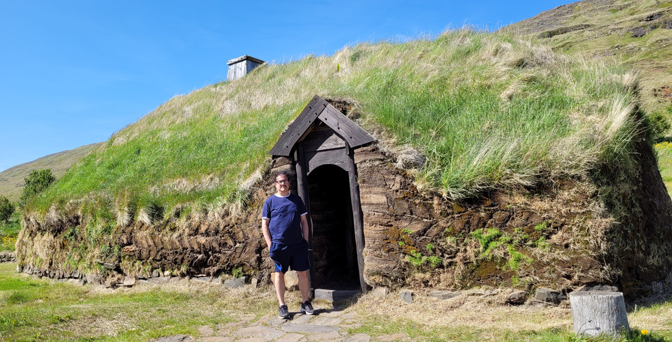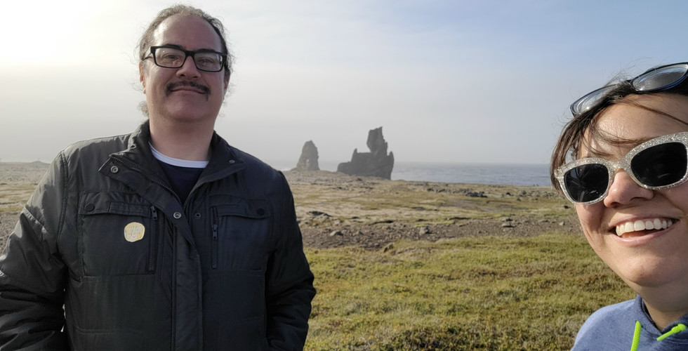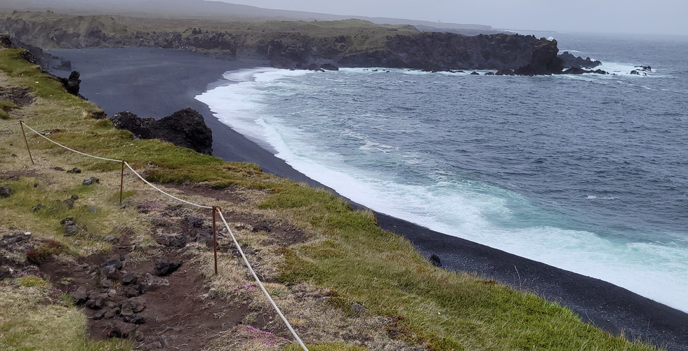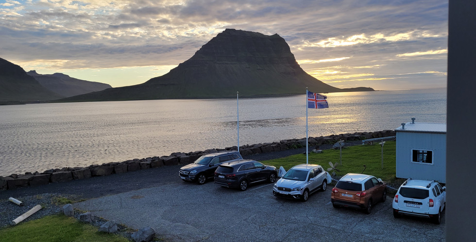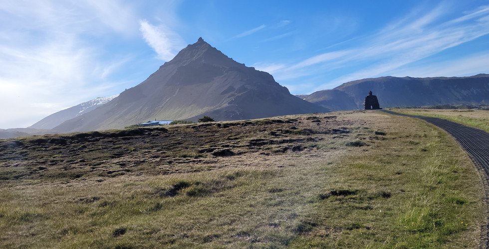 Ian's 46th birthday! It was a much better day than yesterday and jam packed full of cool stuff to see. We started out at an old Lutheran church and the tour guide there told us to check out a Viking fortress down the road - we did - and it was pretty amazing! Then we headed to a free geothermal pool, Gudrunarlaug - it was small, cute, and best of all - no one was there! After that we visited Leif Erickson's house, which was quite old, but solidly built. There was nearly two hours after that of pretty views, but no stops. Then, we hit Snaefellsjokul National Park and we were stopping every couple of kilometers! We saw Songhellir (a cave with a great echo), black sand/pebble beaches, Soxhall crater, cliffs, and a scenic view at a small town called Arnarstapi. Before we knew it, it was 8:30 pm and we were starving (we munched on snacks and leftovers throughout the day). The one thing I planned for Ian's birthday didn't work out because they were all booked (it was a beer garden), but Ian found something just as good, if not better - Sker. There, we shared the mushroom soup (delicious) - he had fried fish and mashed potatoes (he didn't want fries) and I had a veggie burger. Everything was fantastic - we even split an Icelandic apple pie. It was another 20 minute drive to our B & B...I was nervous again because this one was pretty cheap, but it's fantastic! It's right on the water (I included a picture below with Kirkjufell - a mountain - a sunset, and the Icelandic flag below). I'd highly recommend this one if you're ever out here! Tomorrow is our last full day in Iceland. 😪