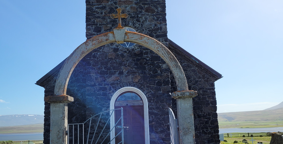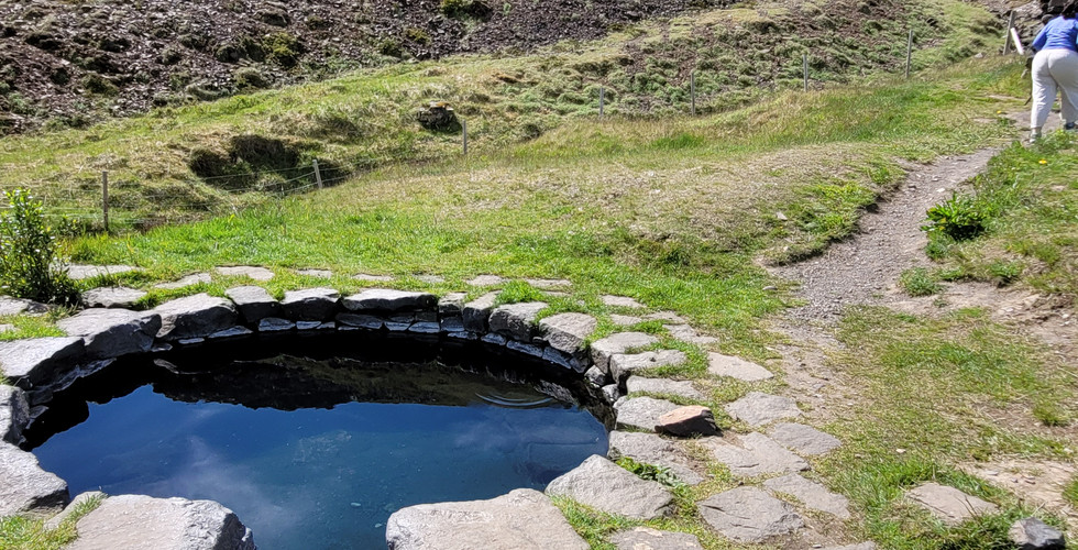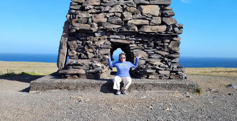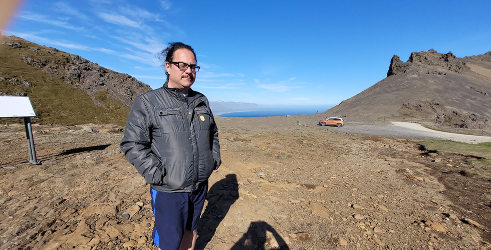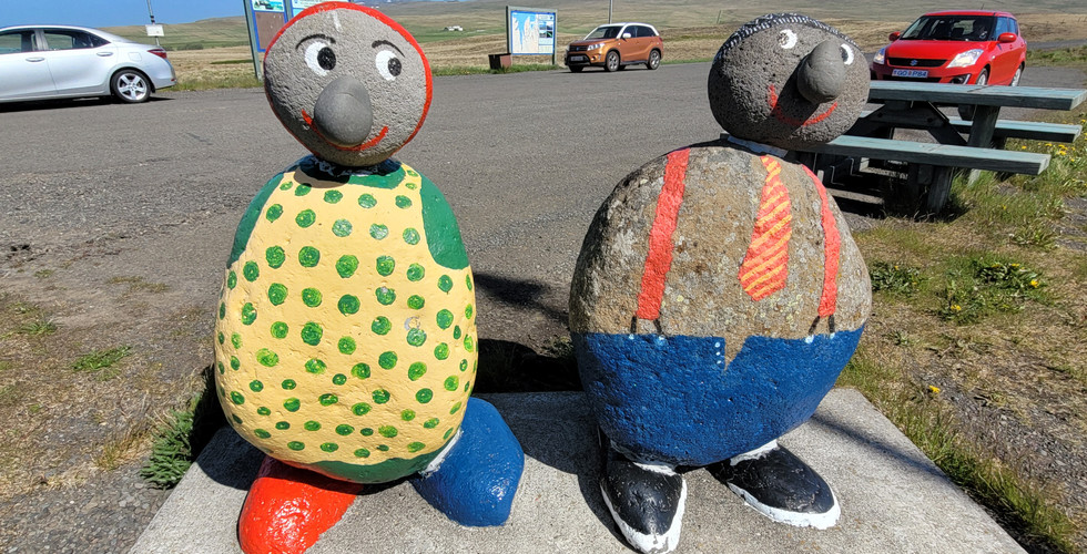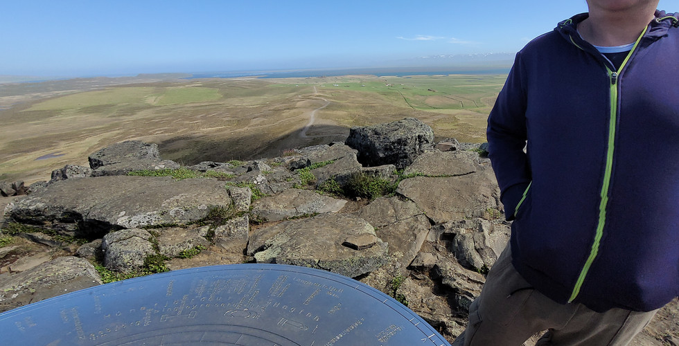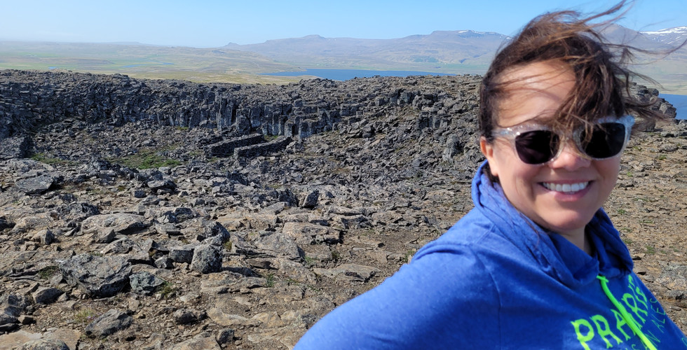 Ian's 46th birthday! It was a much better day than yesterday and jam packed full of cool stuff to see. We started out at an old Lutheran church and the tour guide there told us to check out a Viking fortress down the road - we did - and it was pretty amazing! Then we headed to a free geothermal pool, Gudrunarlaug - it was small, cute, and best of all - no one was there! After that we visited Leif Erickson's house, which was quite old, but solidly built. There was nearly two hours after that of pretty views, but no stops. Then, we hit Snaefellsjokul National Park and we were stopping every couple of kilometers! We saw Songhellir (a cave with a great echo), black sand/pebble beaches, Soxhall crater, cliffs, and a scenic view at a small town called Arnarstapi. Before we knew it, it was 8:30 pm and we were starving (we munched on snacks and leftovers throughout the day). The one thing I planned for Ian's birthday didn't work out because they were all booked (it was a beer garden), but Ian found something just as good, if not better - Sker. There, we shared the mushroom soup (delicious) - he had fried fish and mashed potatoes (he didn't want fries) and I had a veggie burger. Everything was fantastic - we even split an Icelandic apple pie. It was another 20 minute drive to our B & B...I was nervous again because this one was pretty cheap, but it's fantastic! It's right on the water (I included a picture below with Kirkjufell - a mountain - a sunset, and the Icelandic flag below). I'd highly recommend this one if you're ever out here! Tomorrow is our last full day in Iceland. 😪
