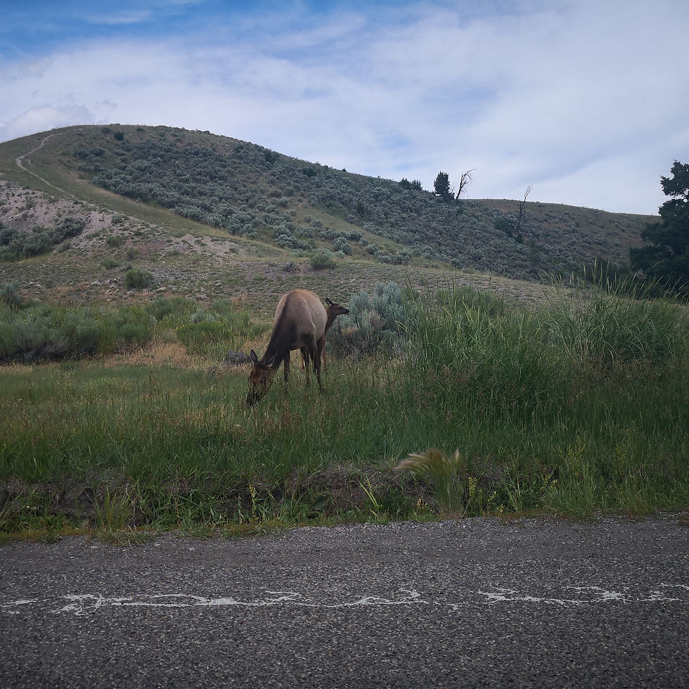 While I was driving to our next stop, I saw a bunch of cars stopped. Everyone was stopped for a bison crossing the road. He/She got real close to the car - I had to put it in reverse to give it some space. It seemed that the bison simply thought the grass was greener on the other side and munched on grass over there. What a treat to see that!