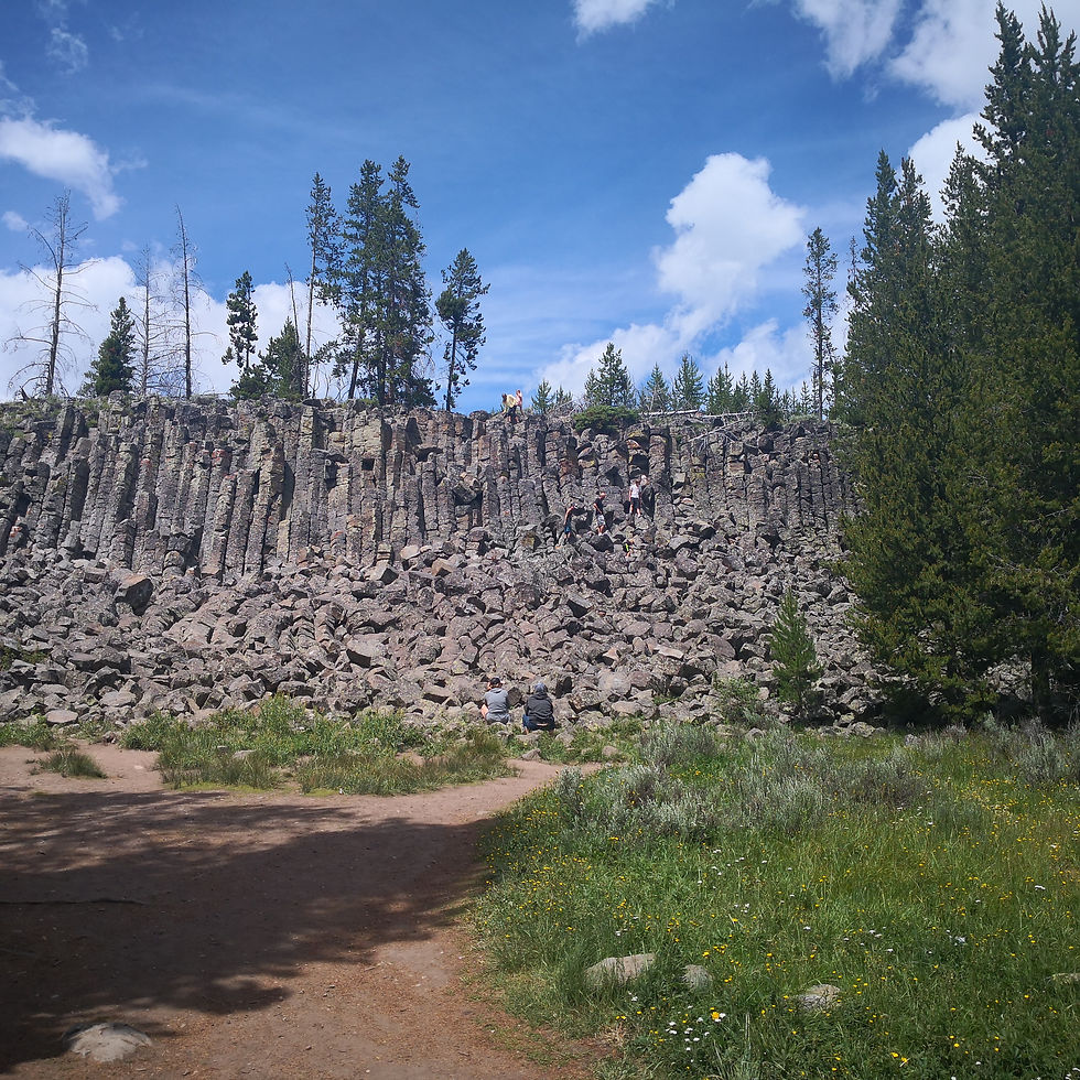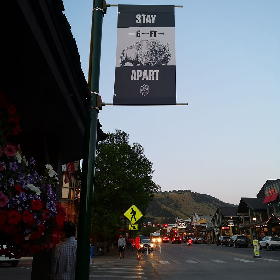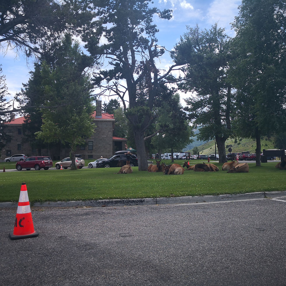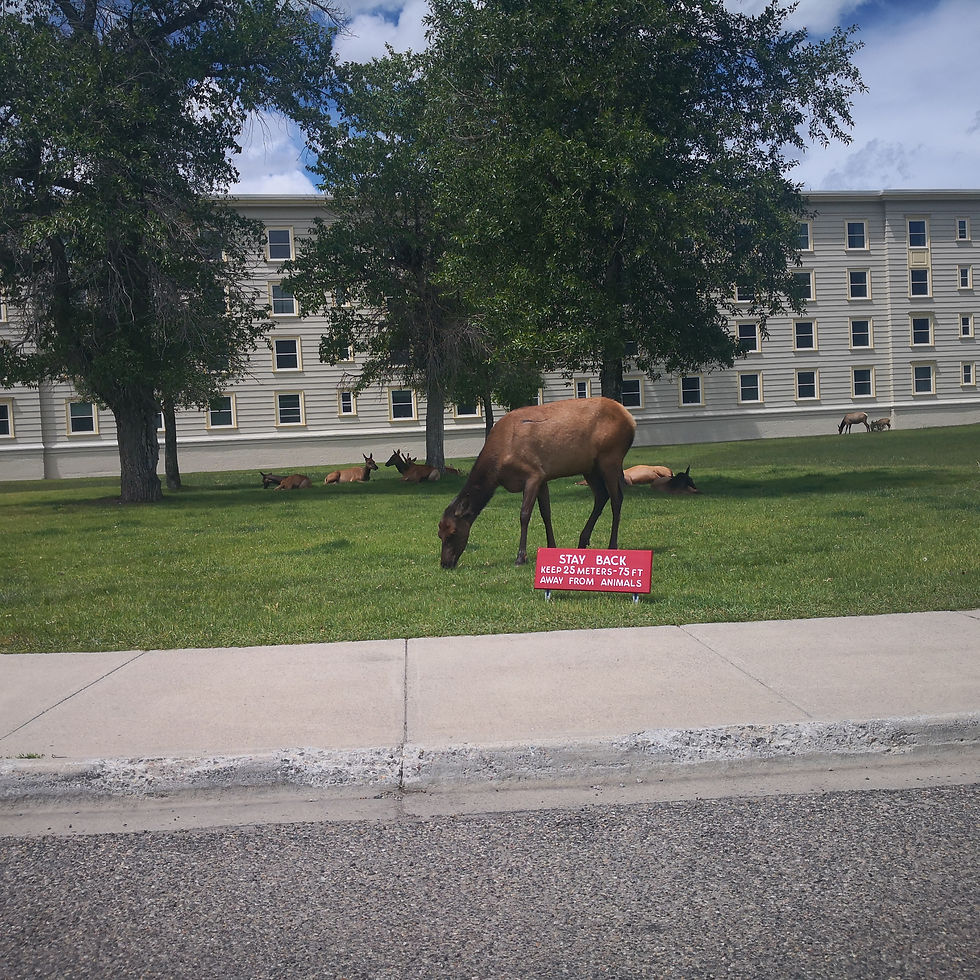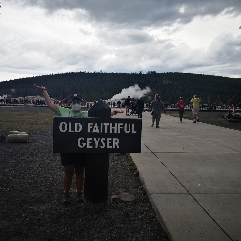 As soon as we entered Yellowstone, we saw elk..or something deer-like in Mammoth. They were in the middle of a bustling shopping village and acted like everything was normal. We pressed on and saw some pretty waterfalls and Sheepeater Cliff. Our next pit stop included a geyser and some bison in the distance. After that, we saw more waterfalls and a canyon. I took some pictures of random groups of people so that you can get an idea of how many people are wearing masks. I also was sure to include a typical sign we saw at most points throughout Yellowstone - you can see they are trying to do the right thing.
