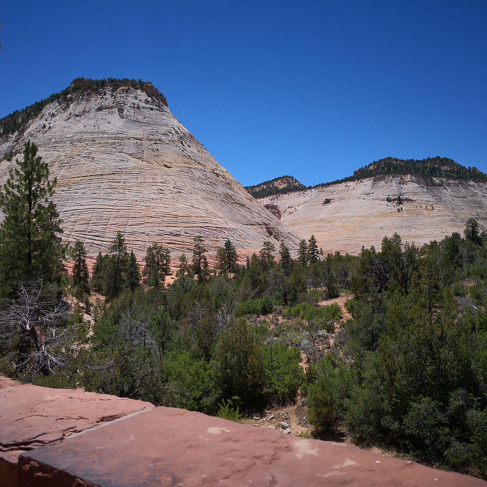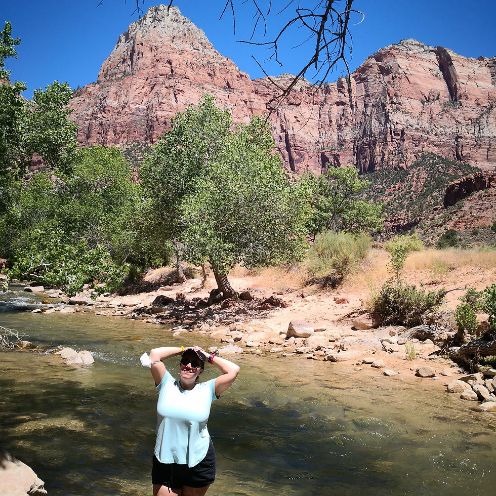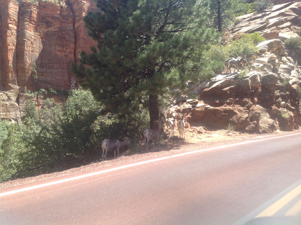 Zion is only an hour and a half drive from Bryce Canyon (although our GPS tried to take us on a route that would take 2.5 hours - nice try GPS!). Last night, I had noted the spots I wanted to see. Shortly after entry, we saw the Checkerboard Mesa which was on my must-see list. We drove further and went through two tunnels (one was a mile long) and then the road we wanted to take for the other sites was blocked. Later, we found out that we needed to take a shuttle for that route, that the shuttle required a ticket, and the tickets were all sold out. Then we thought about it and we realized we didn't want to be on a shuttle for 90 minutes with a mask on. Also, the emerald pools I wanted to see were out of commission for the summer. A ranger suggested taking a trail to a nearby river which we did and waded in for a while. We then drove to what we thought was another scenic view (it turned out to be a somewhat tough hike...and it was 101 degrees...we passed) and saw a bunch of long-horned sheep. They were walking up some rocks along the road. Incredible!